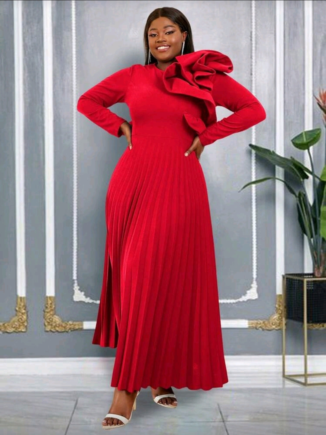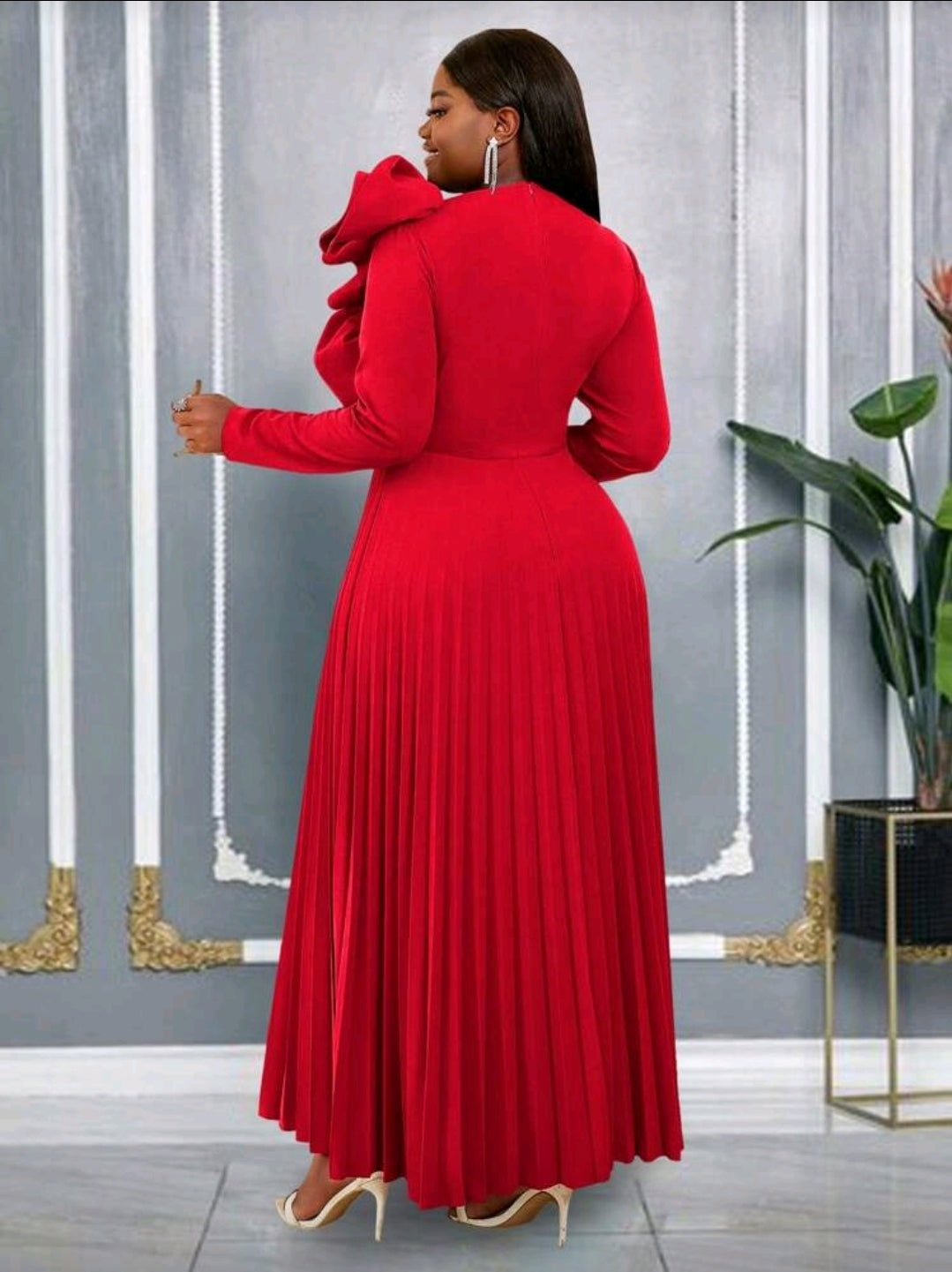 Pleated Maxi Dress with Flower embellishment on shoulder.