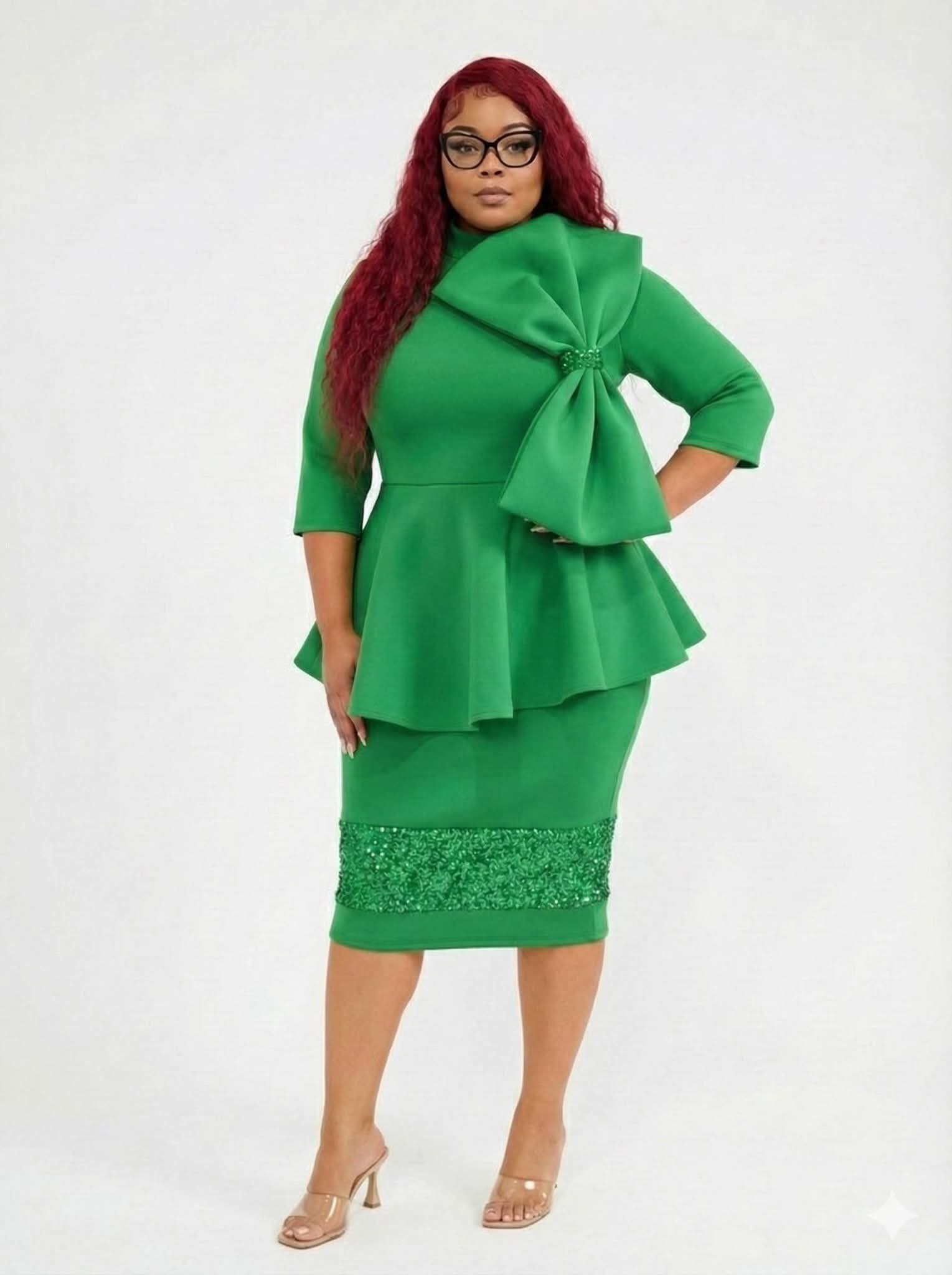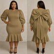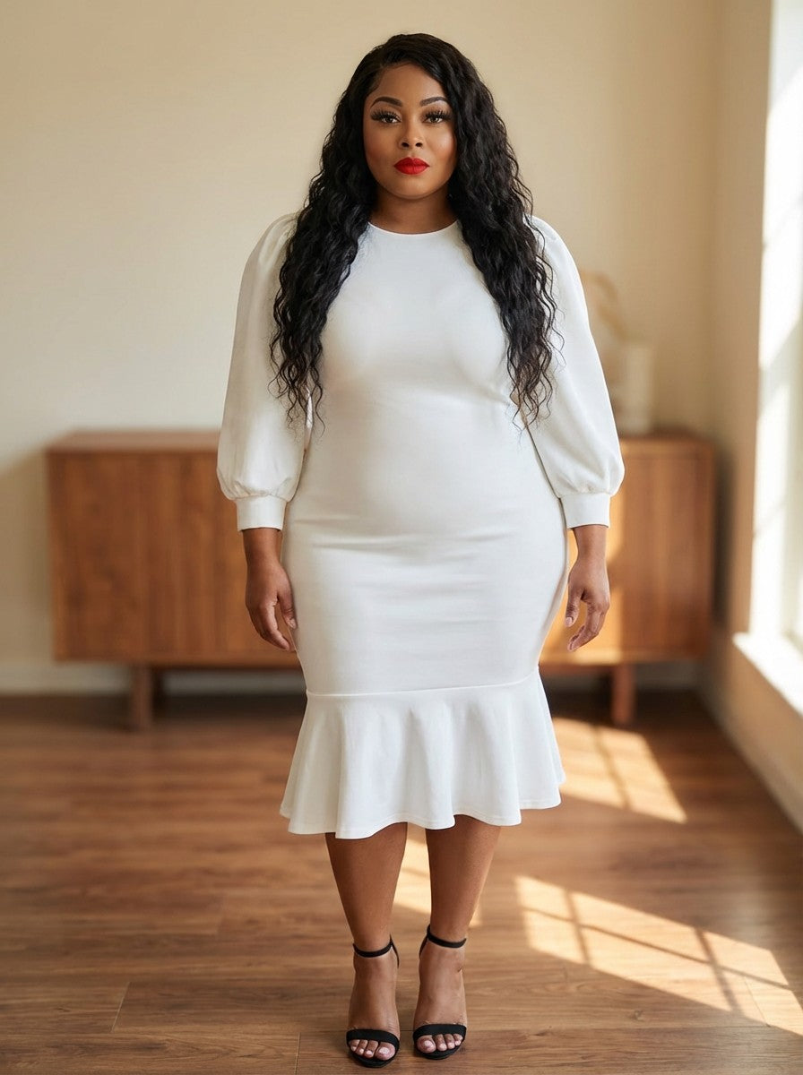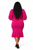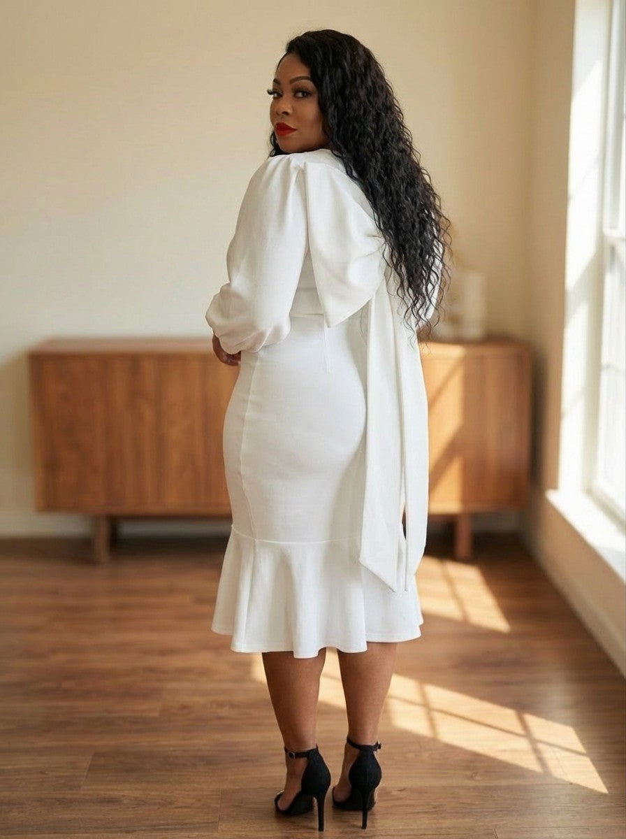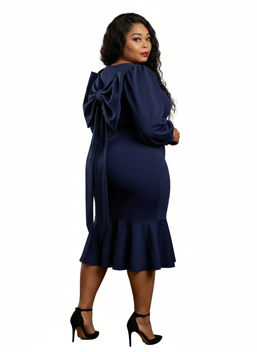Dress features a fitted silhouette with voluminous Puff sleeves and a midi length hem. The background is accented with an oversized bow detail.