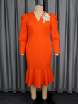 This elegant V-neck long puff sleeve dress features 3D flower embroidery, a bodycon fishtail silhouette, and is made of breathable, eco-friendly worsted fabric. It is designed for summer evening parties, offering a midi length and comfortable fit.